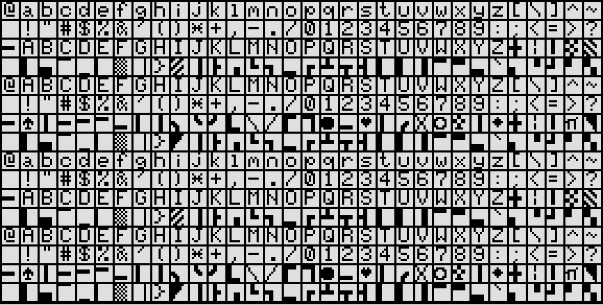 Update Dec 7, 2016: Added a dump of the character ROM from Bil’s LCD and photos. The character ROM is socket U16, which appears to be a 2332 pinout like the C64. The character ROM itself is a 2764 EPROM with a sticker “LCD CHAR ROM“. The extra pins hang out of the socket and are tied to Vcc with hand-wiring, including the highest address line, so 4K is readable by the LCD. Bil and I dumped this 2764 in my EPROM programmer. We did not disturb the hand-wiring, so we only read 4K of it (like the LCD does). The data layout is like other Commodore character ROMs. Steve Gray created a rendering of it. The character set is interesting compared to other Commodore computers; e.g. the presence of a tilde and curly braces that were perhaps added to support the built-in terminal.